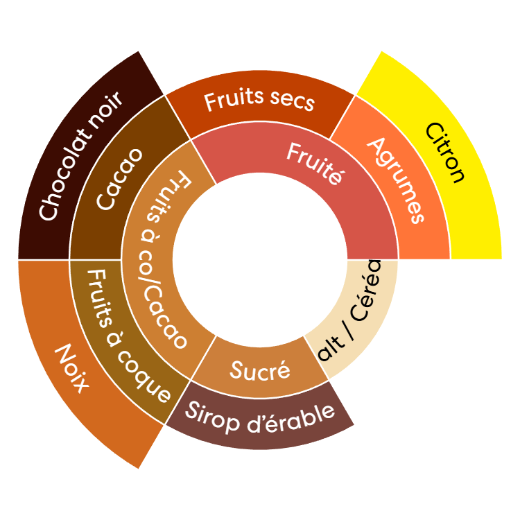 Profil aromatique : Sirop d’érable, Chocolat noir, Noix, Malt et Citron.