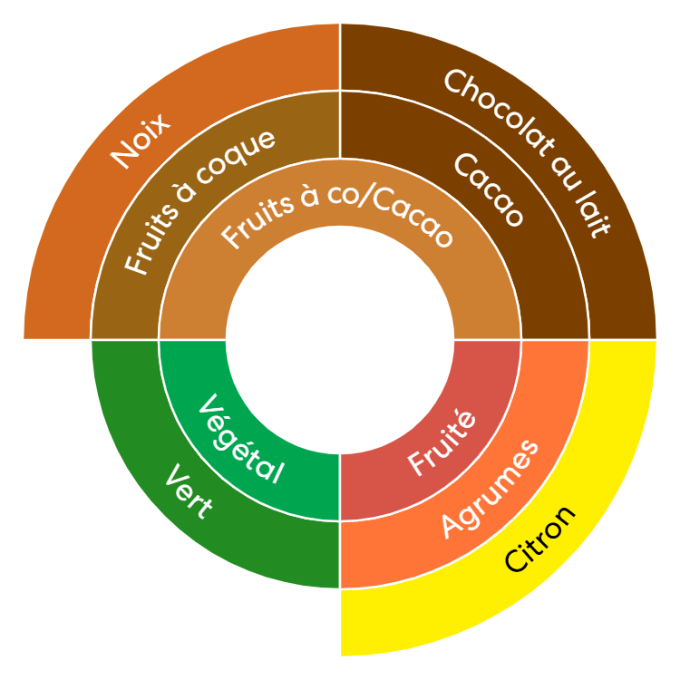 Notes aromatiques : Vert, Noix, Chocolat au lait, Citron