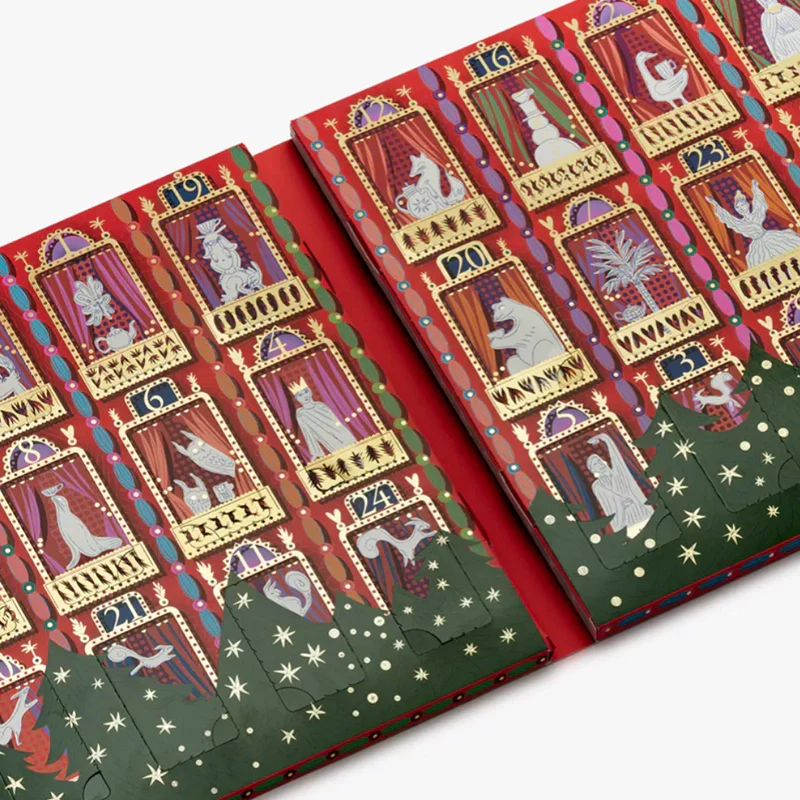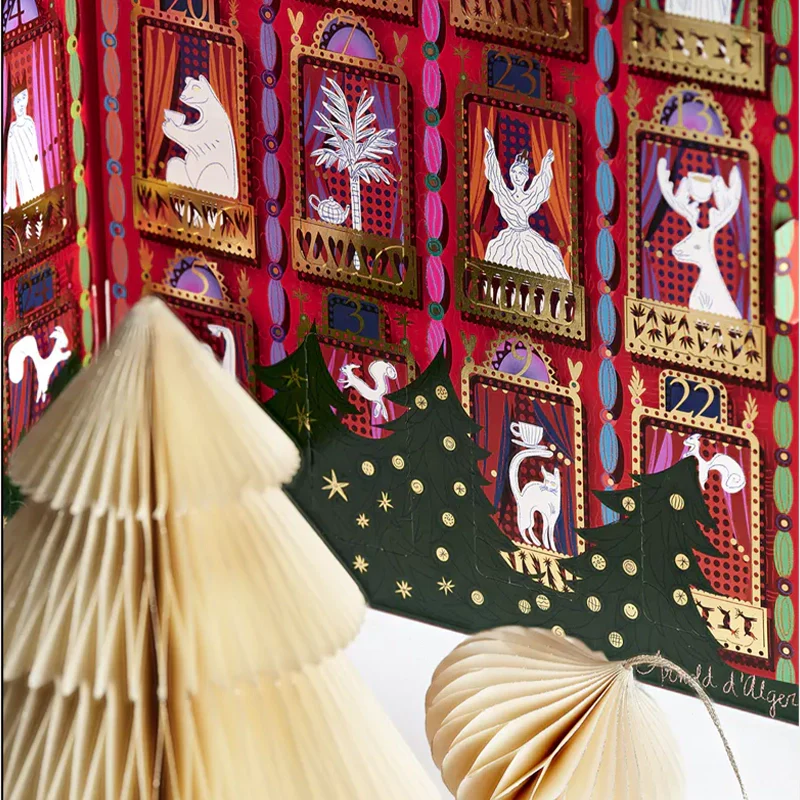 Le décor de ce calendrier est une œuvre d'art. Il représente un paysage enneigé d'un blanc pur. Par ailleurs, on y voit une forêt de sapins parsemée d'éclats d'or. Au centre se trouve un hôtel de rêve, inspiré des anciens palaces. Cette façade élégante cache un intérieur ludique et coloré. De plus, l'architecture s'anime à chaque case. Elle est peuplée d'un personnage facétieux. Par conséquent, ce design apporte une touche de fantaisie quotidienne.