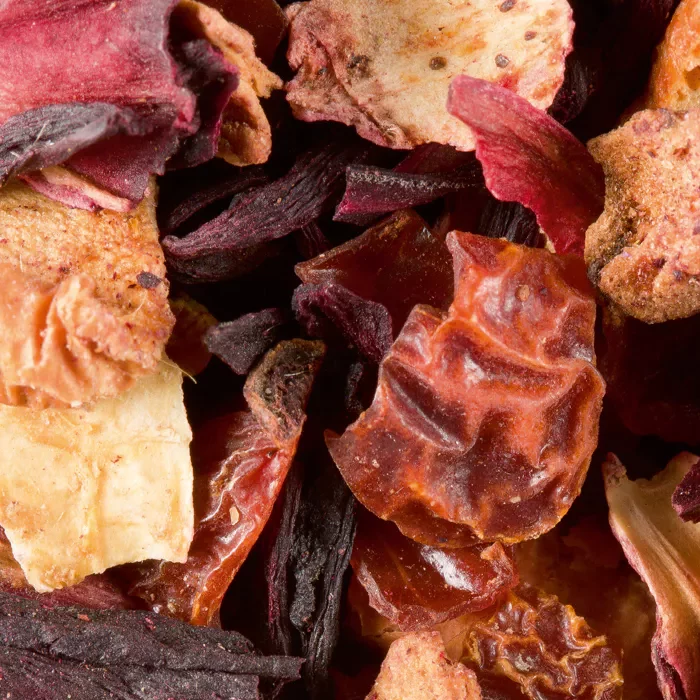 Ingrédients : hibiscus, pomme, cynorrhodon, écorces d’orange, arôme cerise.