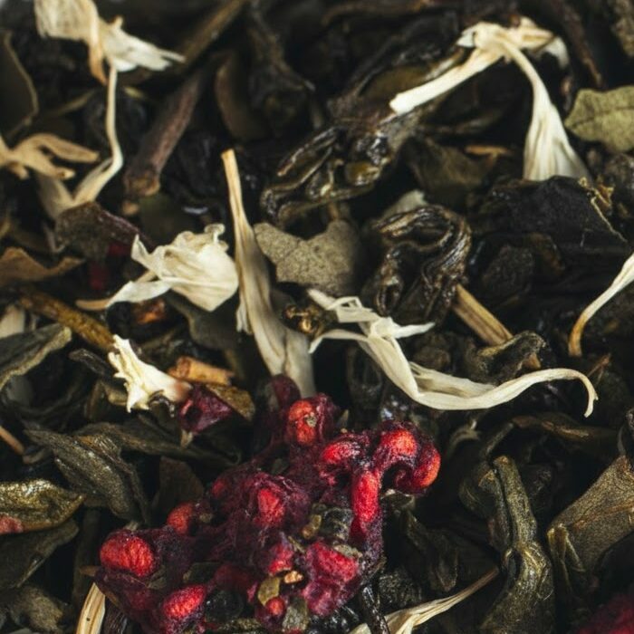Ingrédients : Thés verts, thé blanc, arômes (fruits rouges, amande, miel).
